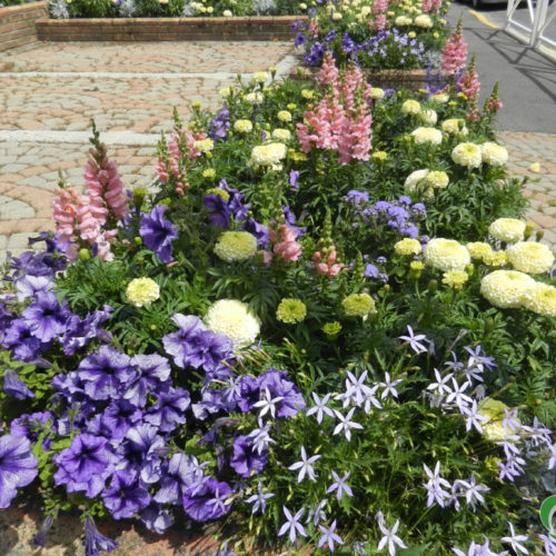 Agératum Haut Bleu, Coléus Kong Rouge, Gomphréna Rose, Lobelia Blanc, Pétunia Easy Wave Violet, Verveine Imagination Violet