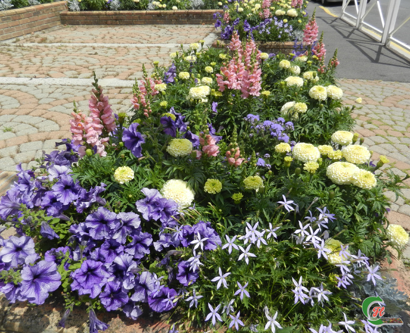 Agératum Haut Bleu, Cinéraire Silver Dust, Lobelia Bleu, Muflier Rose, Pétunia Bleu Veiné, Rose d’Inde Vanilla, Sauge Naine Bleue